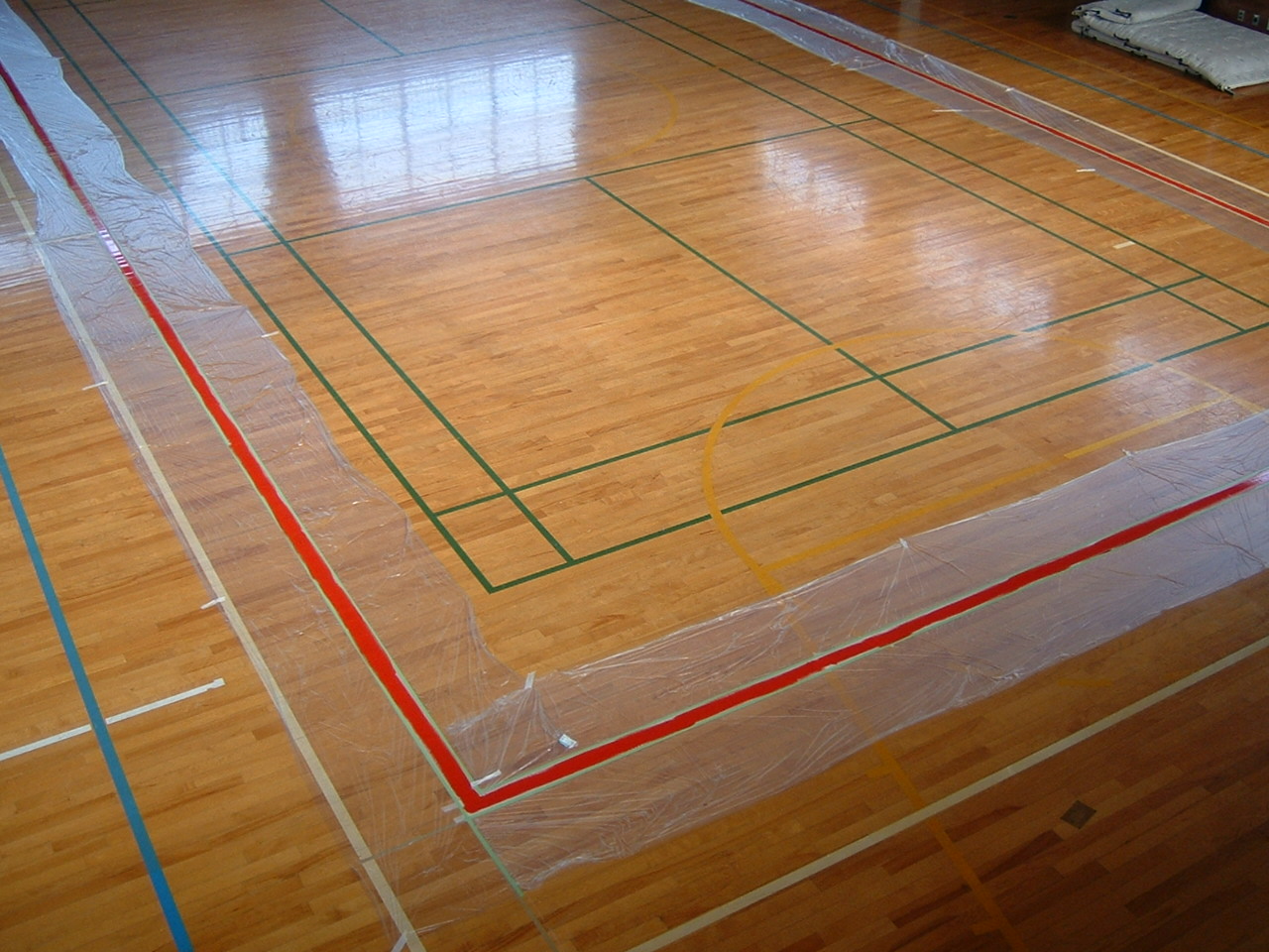 少女バレー用のコートラインを引きました。 子供たちも練習の後、ワックスはがしを手伝いました。