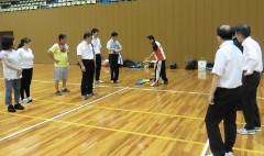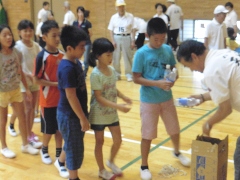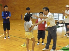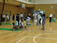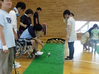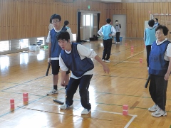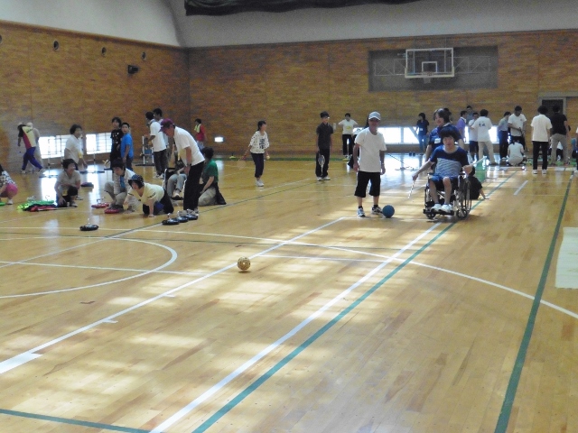 | 障がいのある方と子どもの交流を目的とした活動(子どもゆめ基金事業)=夏休みに入ってから事業説明会があり、近隣の学校へのPRができなかった。 当日はルールを無視して、用具を活用して自由に遊ぶことにした。 カローリングは1チーム4個(同色)として3コート。 スカットボール2コート。スマイルボーリング2コート。ラダーゲッターは4ゴール。ユニカール1コート。クロリティー1コート。 デッキスティックゲーム2。 SL創作のスイートテニス1コート。空き缶ボーリング1レーン(アルミの空き缶に石ころを15程度入れ、セパタクローのボールを投げて倒す)。 ストラックアウト1ゴール(ドッジビーを投球する)。キャッチボールをサークルに入れるゲーム2。 その他にアップダウン、マンカラ、キャチング・ザ・スティック、サークルジャンプを持参していた。 アイスブレイクはみんなでレクゲーム。(ポカリスエットを全員に) どのような人が来ても対応できる態勢で臨む。 最後に、ぽけっと利用者と子どもに表彰状をスタッフより授与 障がいのある人23名(ぽけっと18名)。子ども11名。社協研修生2名。県大生2名。視察として少年補導員(倉敷署)3名。障害者スポーツ指導員6名。一般参加(大人)5名。 レク役員3名。ぽけっと職員8名。天城スタッフ18名(重複あり) 参加者70名弱 |