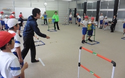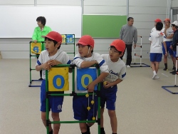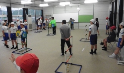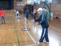 | 雨のため屋内で活動。(スナッグゴルフを予定していたが) 少し場所は狭いがラダーゲッターを3コート 部員の数に合わせ、4名1チームで1人2球で試合。 ボールの予備を購入していたので、臨機応変に対応! 休みの子がおり先生が4年生に入る。 松葉杖の子も参加できる。 狭い会場が幸い、大いに盛り上がる。 時間内に3試合もできた。 |