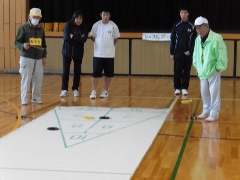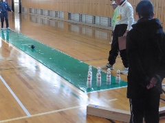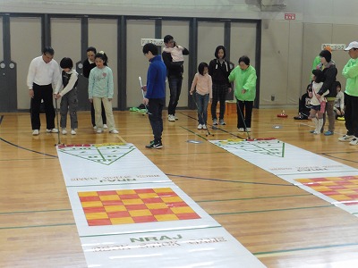 | 岡山県カローリング協会よりカローリング。 NPO法人スポーツライフ '91天城よりデッキスティックゲームを紹介 お父さん、お母さんに連れられて幼児が意外とたくさん来ます。(その世代の親がこういったイベントに興味があるということか? |