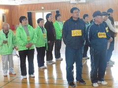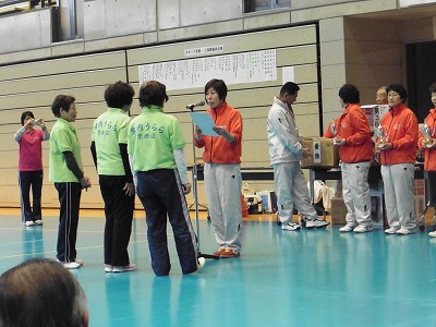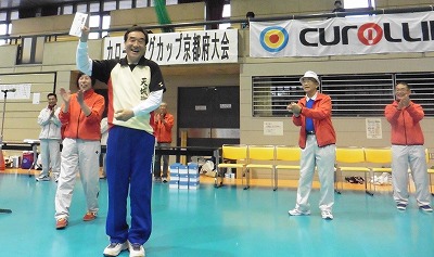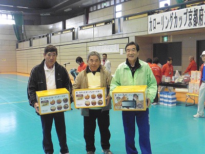 | 京都府大会は非常に賞品がよく参加者に好評。(会長の顔の広さ、社会的地位の高さがうかがえる) 今年は96チームが参加(天城はSLとバロンズの2チームが参加) 当初、前日にミズノ神戸大会が予定されていたが、参加者少数により中止 (1泊で両大会参加予定=正直ミズノの大会は賞品が悪すぎる=最初のころはよかったが=5年前) SLはじり貧で6位(優勝は地元草内うらら)、バロンズ50位。両チームとも賞品ゲット。 全チーム代表によるニアピン大会(距離約50m=ラバーの体育館のためジェットローラーが走らない。=木の床とは全然違う。) ニアピン大会優勝=葭野 |
