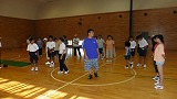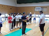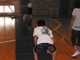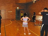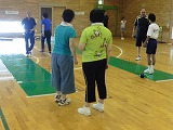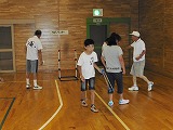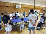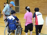 参加者がガクンと落ちました。 障がいのある人の参加は2名のみ。 高齢者が6名 参加者は31名 夏休みボランティア体験で参加している中学生4名 (男女各2名)、高校生2名 (女子2名) みんなで楽しく試合をしました。 |