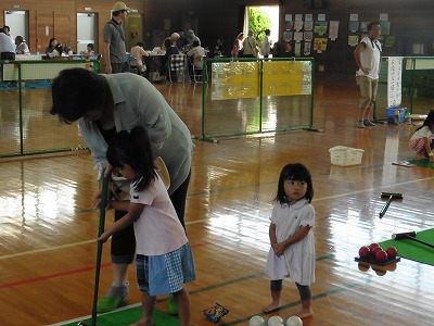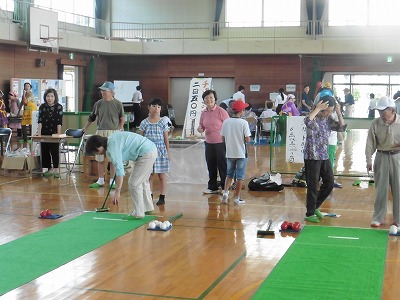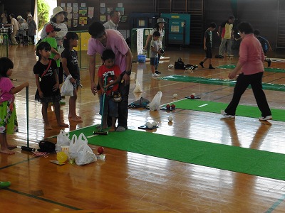| カローリング、スマイルボウリング、スカットボール、クロリティー、デッキスティックゲームを各2持参しました。 (派遣指導者4名) 大勢の親子連れが参加してくれました。おじいちゃんの参加はなし?(約1名!) 皆さん初めて目にするスポーツを楽しんでくれました。 |