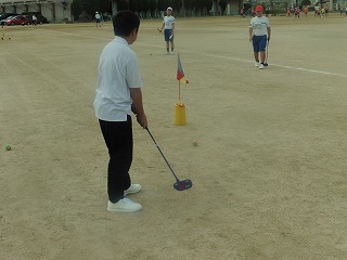 10月は1日のみ、11月はクラブ活動はなし。 今回はスナッグゴルフとグラウンドゴルフを各4ホール。 スナッグゴルフは距離が取れないので、フルスイングというわけにはいきませんでした。 ソフトボールの球が転がって来る中、 グラウンドの隅を使い、 障害物を利用したコースは子供にも好評でした。 担当の先生も感嘆! |
