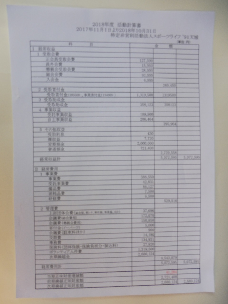 NPO法人スポーツライフ ’91天城 決算報告書