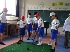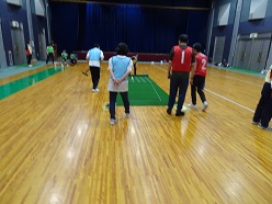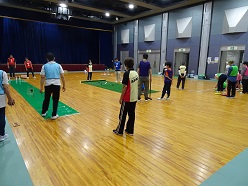 | 雨でクラブは3階のワールドルーム=今日は有城荘のGG講座もあるため葭野・和田の二人で 対応=重い用具は大変なので・・・ 1チーム4名でトーナメント戦を行いました。 クラブ員はみんな初めてのスポーツです。それでも試合ができます。 |