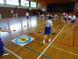 | 今年度より天城小学校ニュースポーツクラブは廃止され、運動クラブ員全員にニュースポーツを体験させることになりました。 運動クラブを、屋内スポーツ、室内ゲーム、シュートゲーム、ソフト・サッカー の4グループに分け年間2回ニュースポーツを行います。 6月11日は屋内スポーツの46人がカローリングを行いました。6月25日にはワールドルームで室内ゲームの子供たちがラダーゲッターを行いました。 |