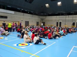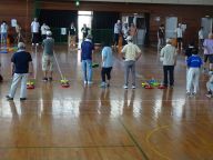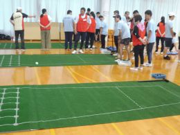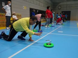 | メインアリーナで開会式、その後、卓球、バドミントンの試合が行われました。 サブアリーナではボッチャ、囲碁ボール、カローリングの体験会を行いました。 SL天城から10名のボランティアが参加して、学生ボランティアの方々と協力しながら試合を楽しんでいただきました。 |