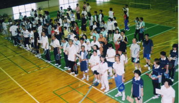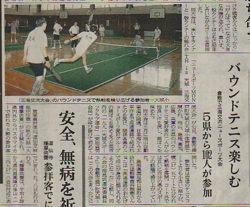 第1回三海交流大会バウンドテニスの部を報じた山陽新聞の記事 第1回大会は『ニュースポーツMONTH in 天城』の名称で、学区ニュースポーツ交流会、バウンドテニス交流大会、 ソフトバレーボール交流大会と3週にわたり行いました。 毎週大会開催はスタッフにとって大変でした。 そこで、2回大会より、バウンドテニスは6月第3日曜日、ソフトバレーボールは9月第3日曜日としました。 |